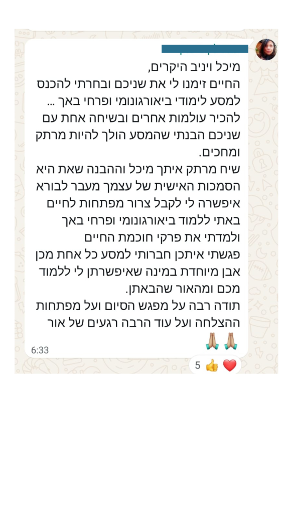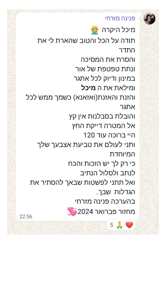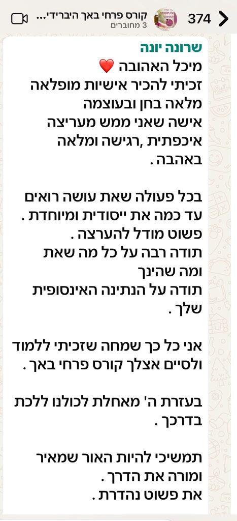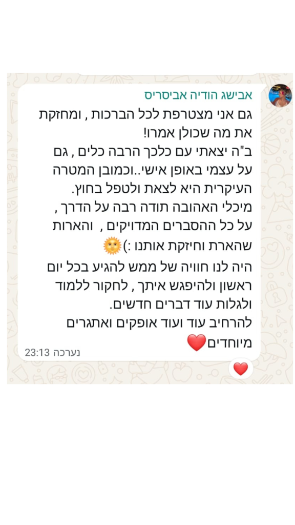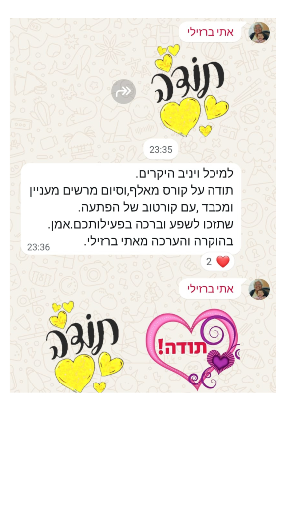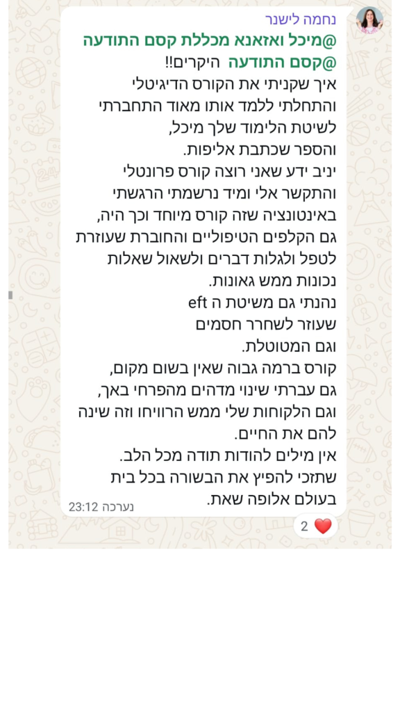 בקבוצת הוואטסאפ הייעודית תוכלי לשאול שאלות, לקבל תשובות בזמן אמת, לשתף חוויות ולדייק את ההבנה שלך בכל שלב בלמידה. זה המקום שבו התיאוריה פוגשת את החיים, ואת מקבלת ליווי שמחזיק לך את היד בדרך.